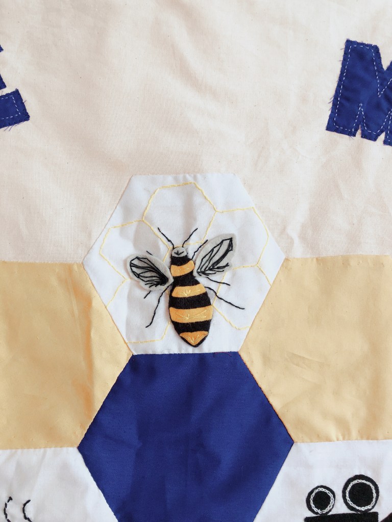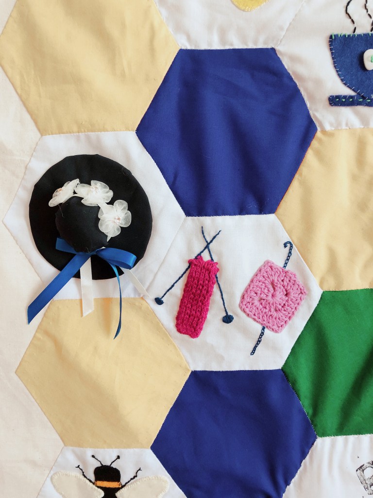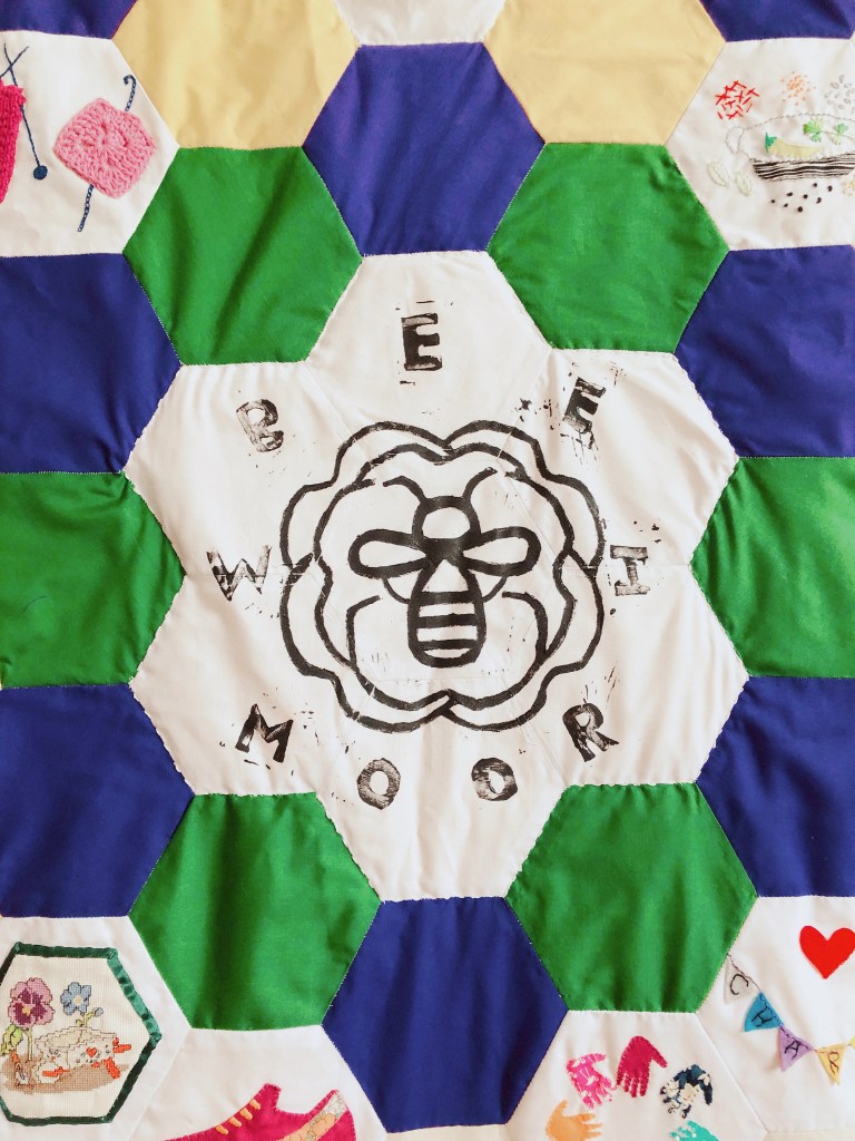 Last Spring a group of Bee Moor crafters came together to work on a new banner to represent our fabulous WI. Designed by one of our members, Lauren, each appliqued and embroidered hexagon represents one of our sub-groups, or a key part of being a member of Bee Moor WI.