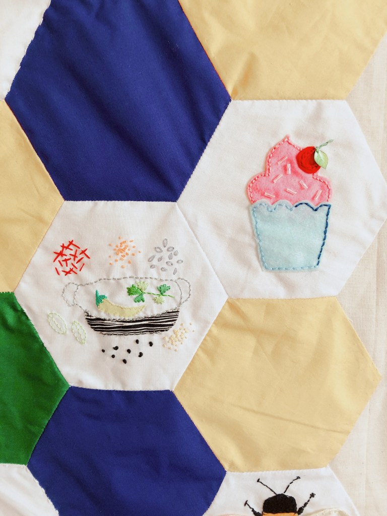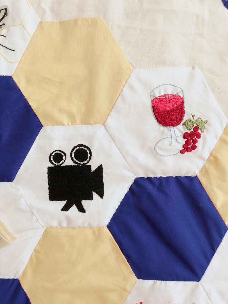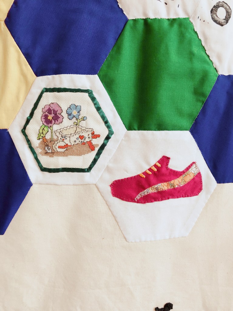 We each embroidered or appliqued at least one hexagon at home before we met again. This meant we were able to have a variety of techniques and styles within the banner.