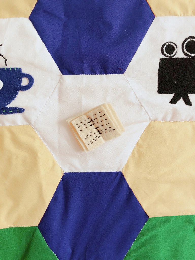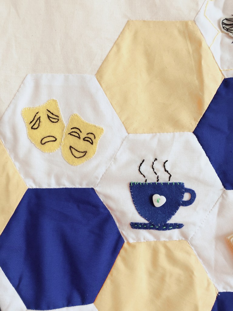 Once we had all finished our embroidery or applique we came together again to arrange the hexagons. We all took a few hexagons away to hand sew together to meet the design, and swapped sections again until we had the full patchwork ready.