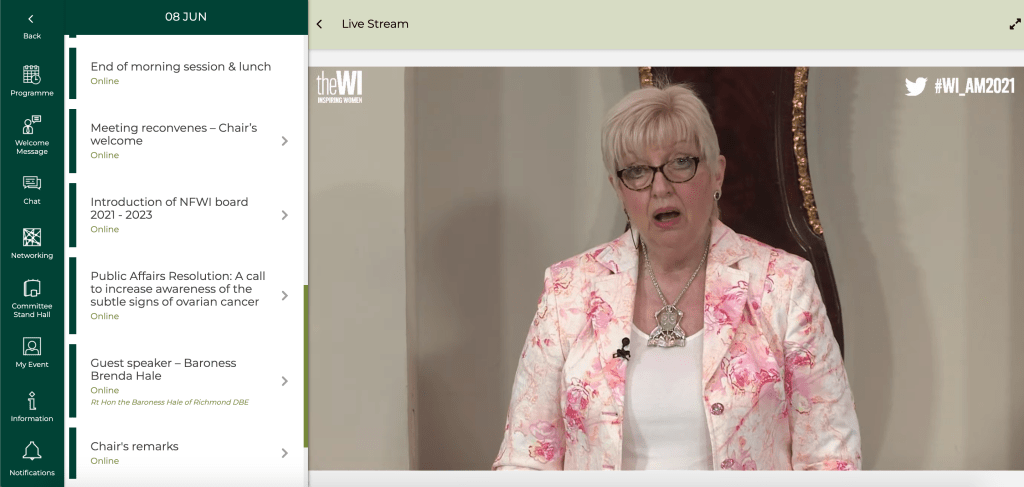 This year was an unusual meeting being the first virtual annual meeting where all delegates, advisors and observers were at their homes and only watched through a special website and live video feed. NFWI have done an amazing job to recreate all the elements of the in-person meeting, the website included “Tea rooms” where we could meet and video chat with fellow attendees and a “Stand Hall” where we could visit the NFWI shop, Denman at Home stand and more to learn about all the work that NFWI does.
